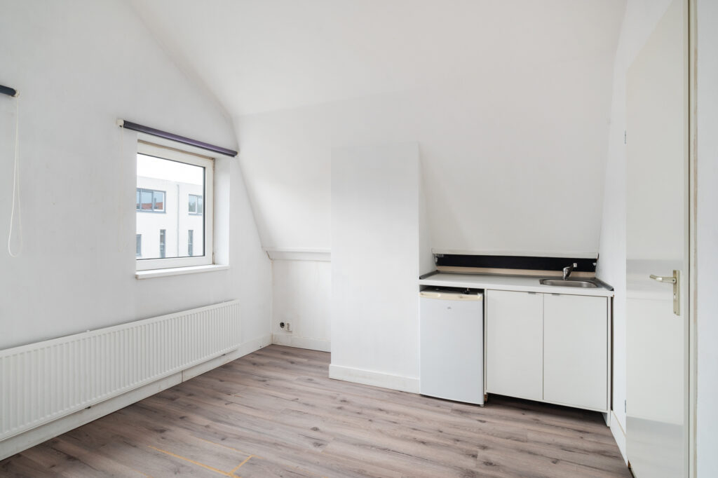 Woonkamer. Keuken. Badkamer met wandcloset, douchecabine, wastafel, wasmachine aansluiting. Slaapkamer achter met deur naar balkon achterzijde op het oosten