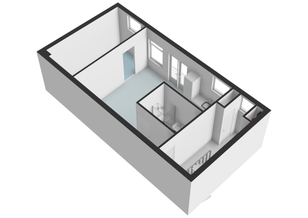 Eerste verdieping: entree, open hal, badkamer met douche, toilet, wastafel en witgoedaansluiting. Woonkamer met frans balkon en open keuken met hoekopstelling. Slaapkamer achterzijde.