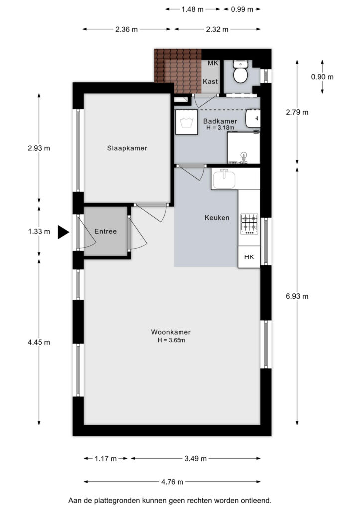 Begane grond: entree, hal, woonkamer met open keuken, slaapkamer, badkamer met douche en wastafel, toilet.