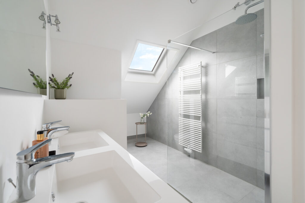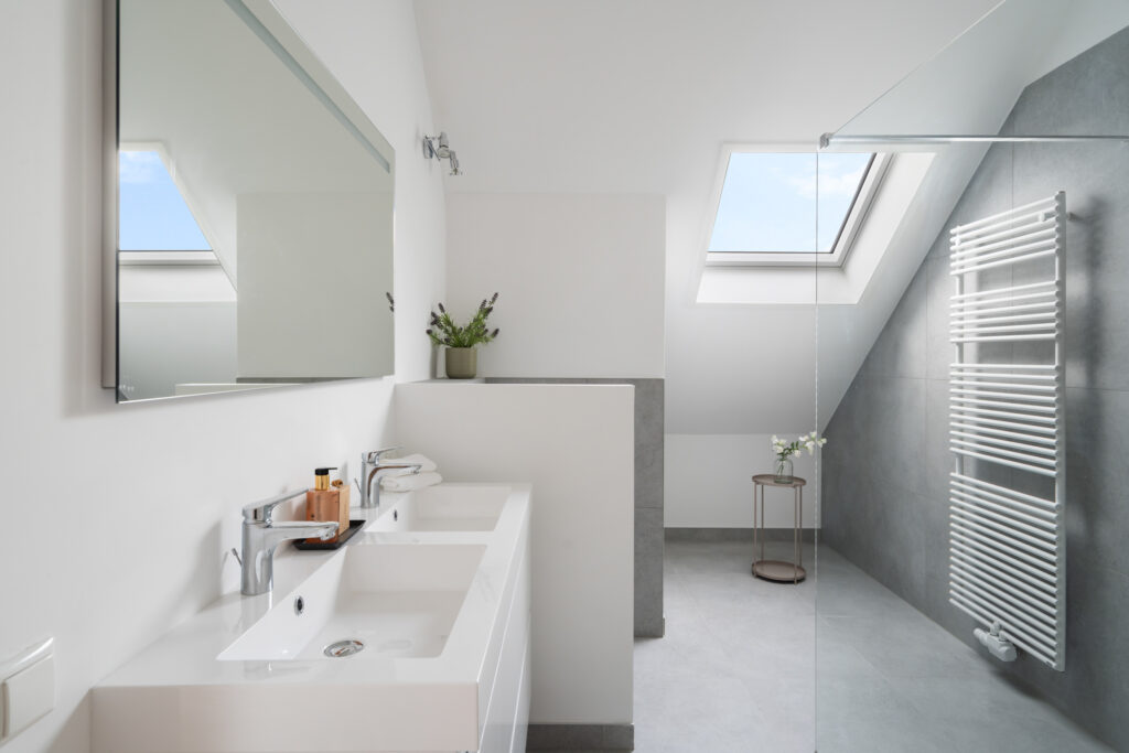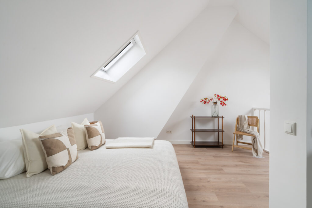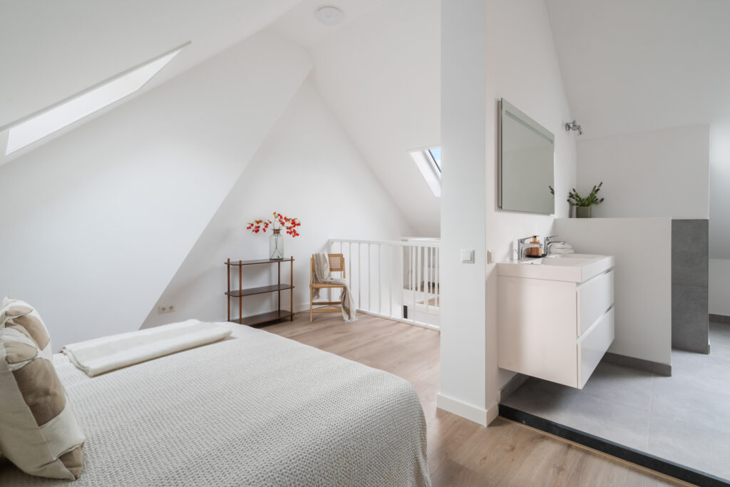 Vierde verdieping: Grote open slaapruimte met luxe badkamer ensuite.