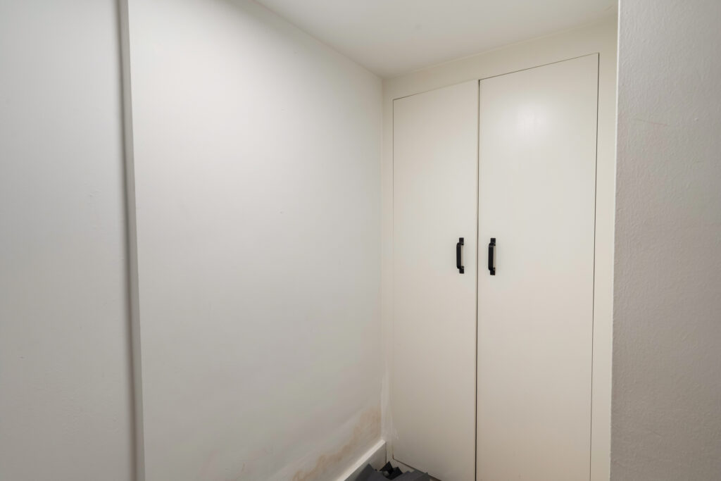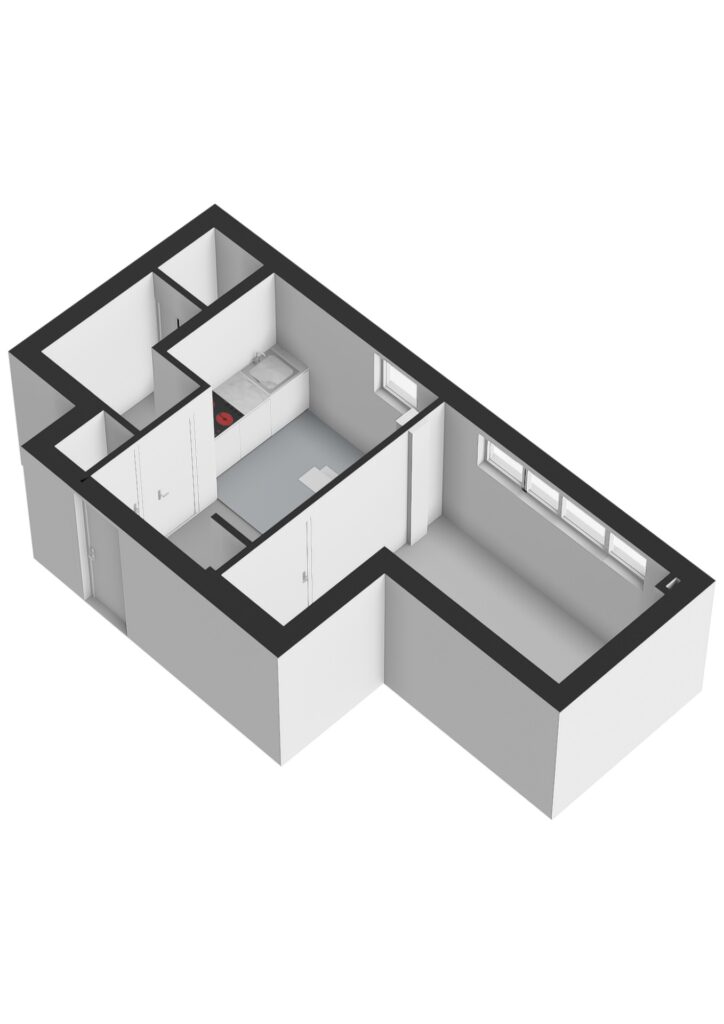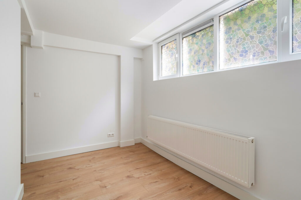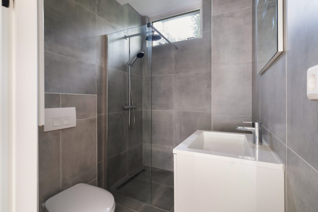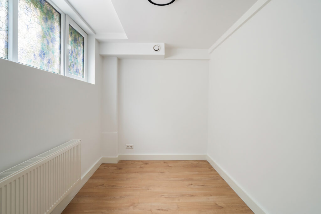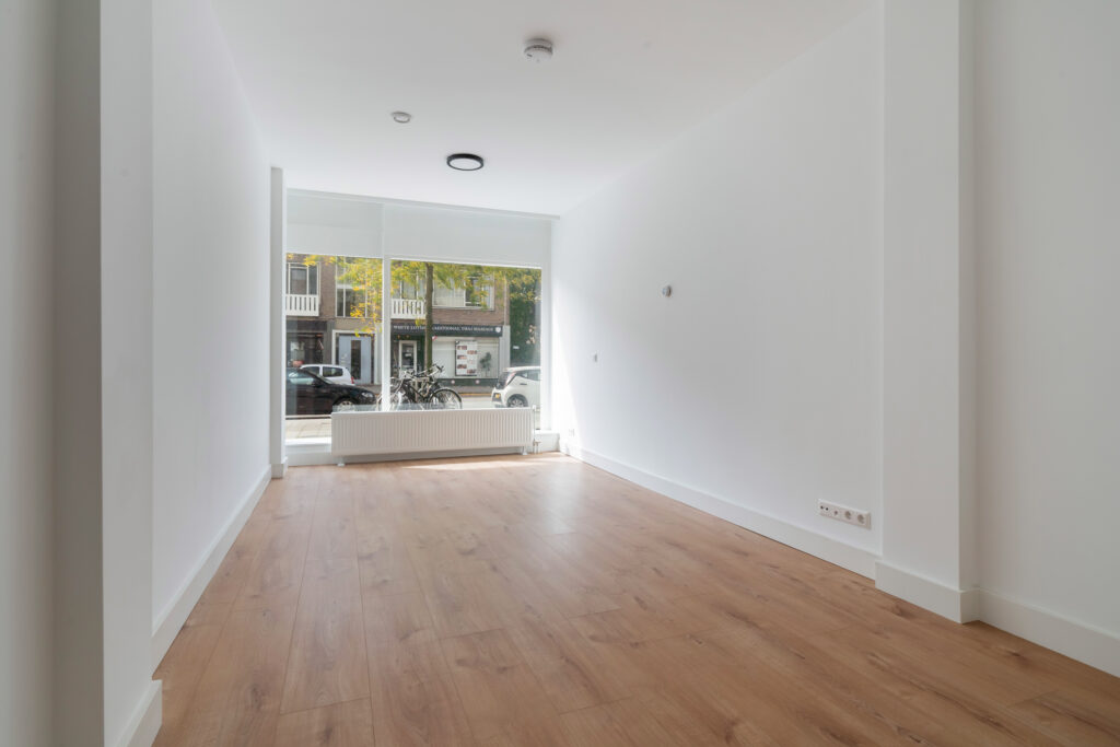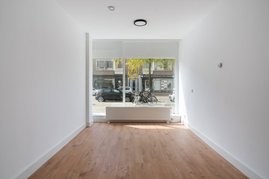Begane grond: woonkamer met grote raampartij en badkamer aan achterzijde