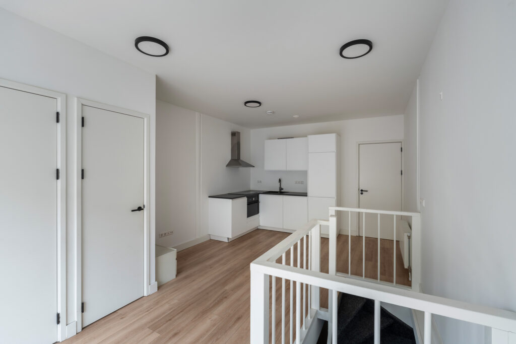 Op de begane grond bevindt zich een lichte woonkamer met open keuken, compleet met inbouwapparatuur. Hier is het aangenaam wonen en genieten van een praktische leefruimte.