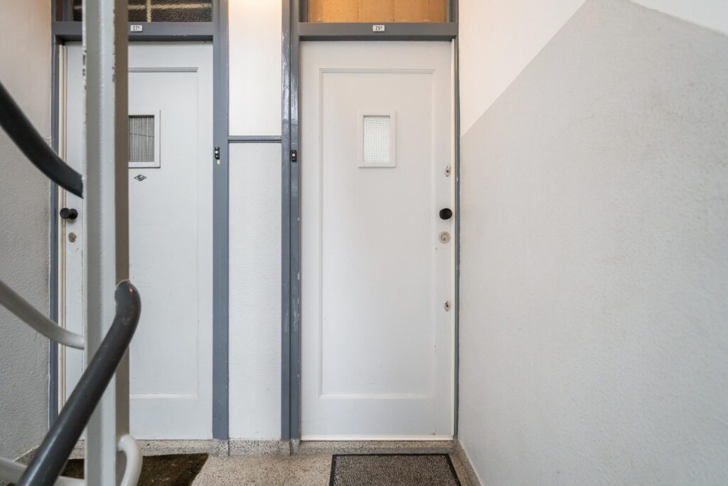 gezamenlijk entree in het portiek met de brievenbussen en toegang tot de bergingen