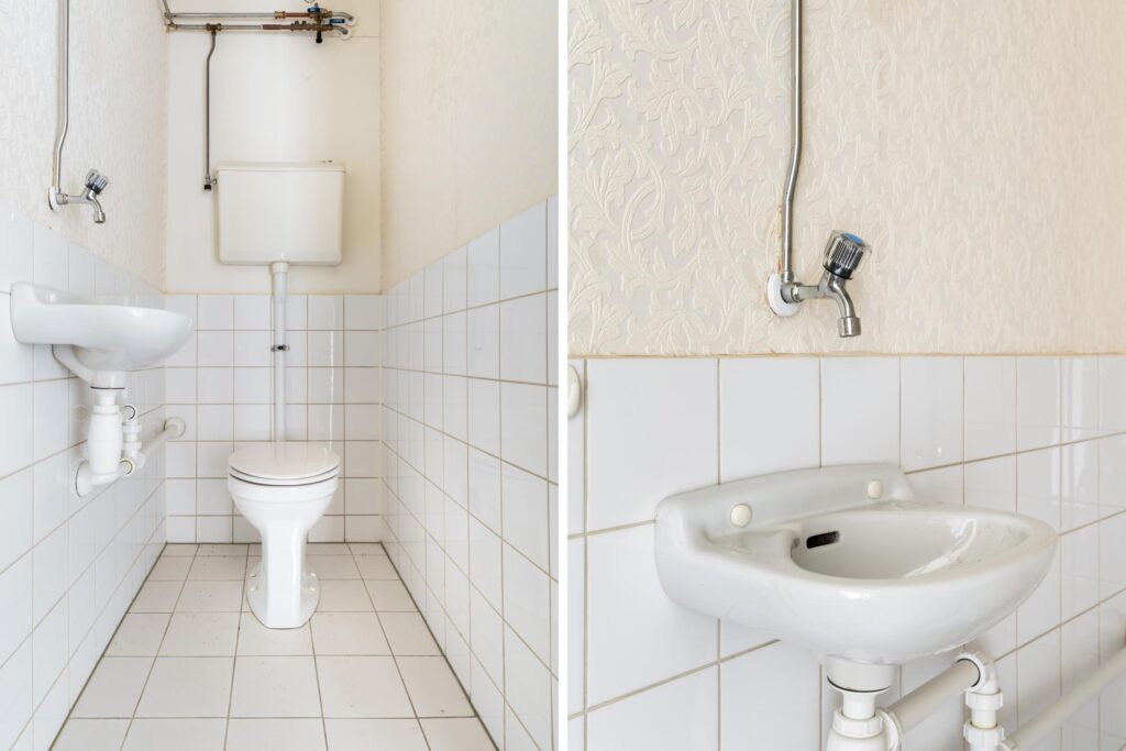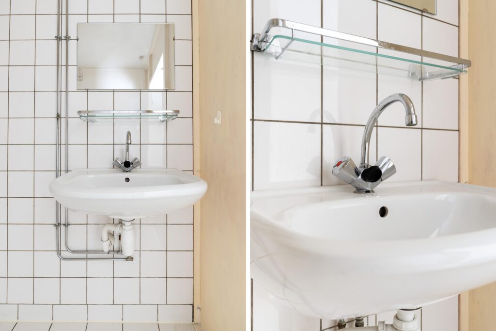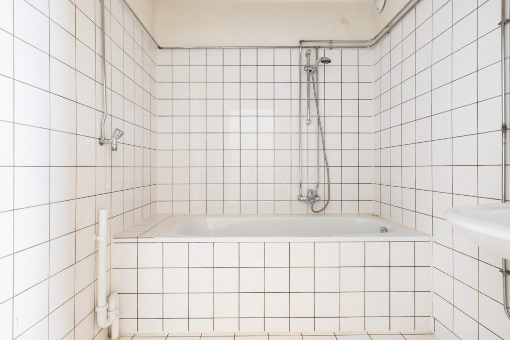 – nette eenvoudige badkamer met ligbad en wastafel.