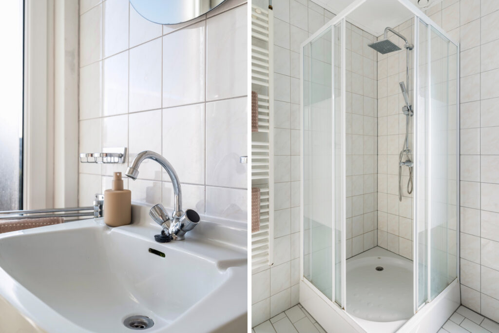 Overloop, tweetal slaapkamers, badkamer met douche en wastafel.