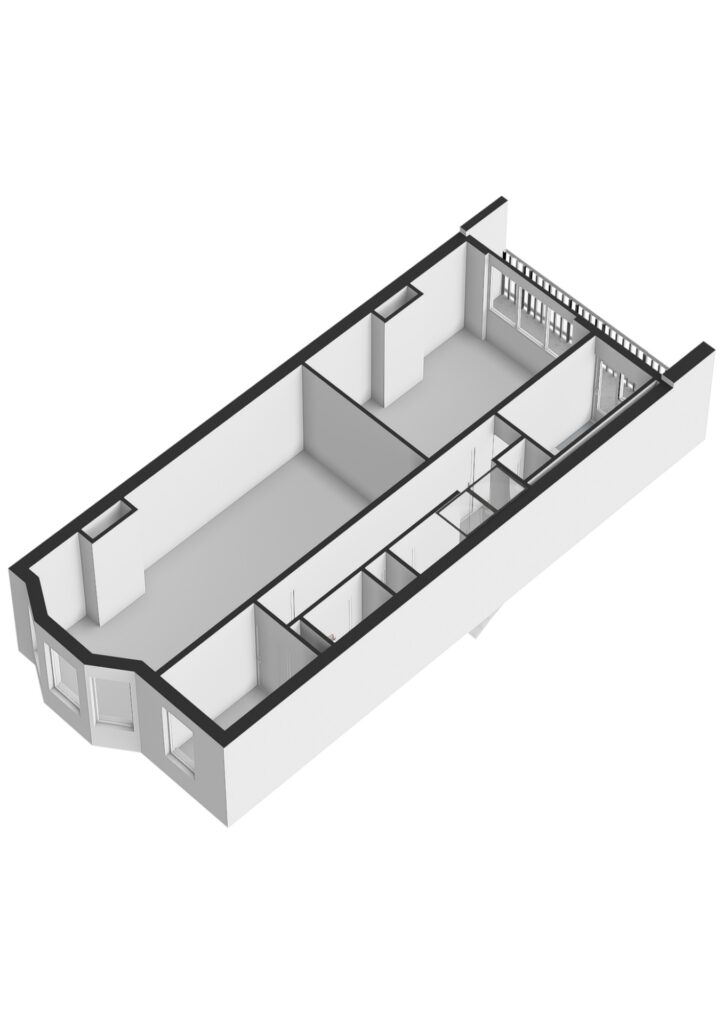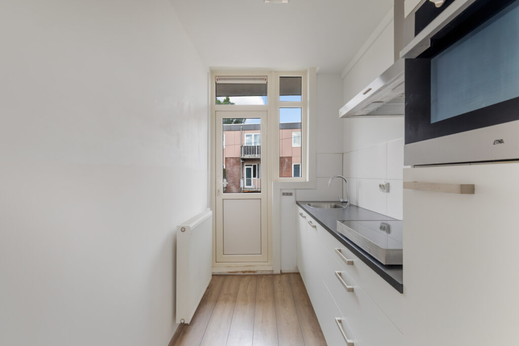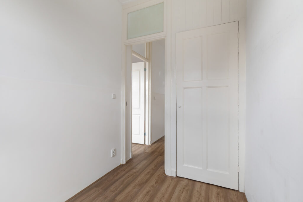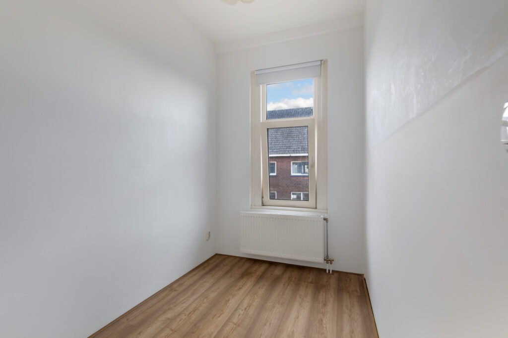 Tweede verdieping: hal met toilet en meterkast, ruime woonkamer met erker aan de voorzijde. Dichte keuken met nette opstelling. Twee slaapkamers en de badkamer. Het balkon is bereikbaar vanuit de keuken. Trap naar plat dak.