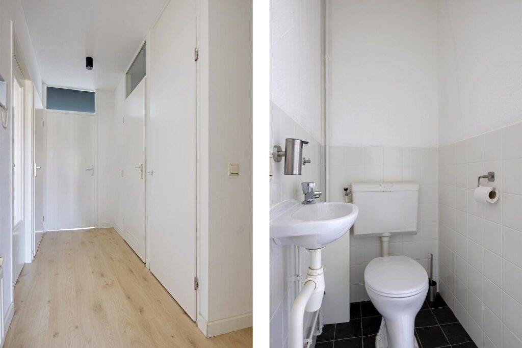 Tweede verdieping: entree, hal met toegang tot het toilet en de badkamer, slaapkamer voorzijde en slaapkamer achterzijde. Woonkamer met zitgedeelte aan voorzijde en eetkamer met open keuken aan de achterzijde. Ruim balkon aan de achterzijde.