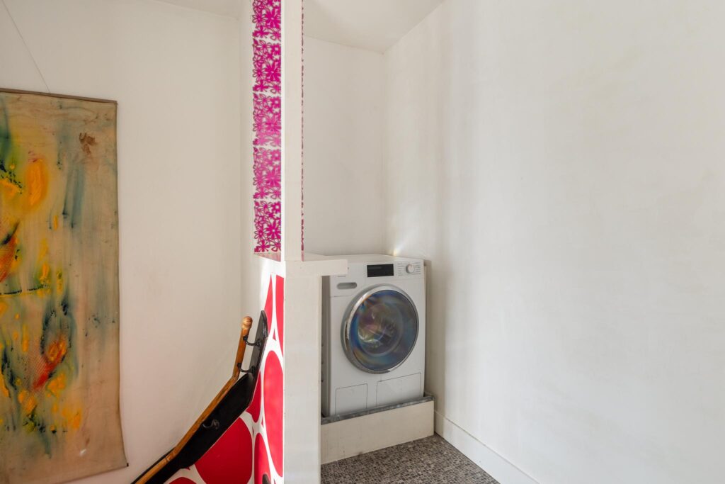 Overloop met witgoedaansluiting, slaapkamer II en de badkamer met een ligbad, tweede toilet en de wastafel.