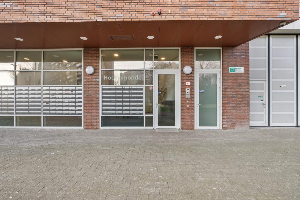 Afgesloten entree met bellentableau met videofoon, brievenbussen en liftinstallatie.