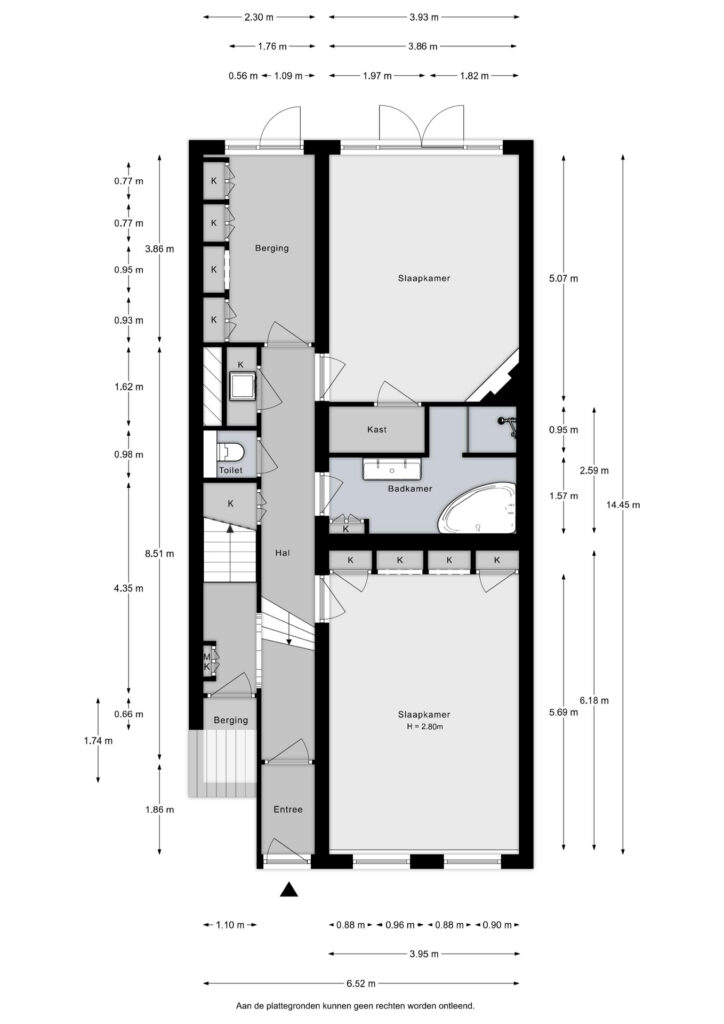 Eigen entree, tochtportaal, hal met vestibule. Slaapkamer voorzijde met kastenwand. Slaapkamer achterzijde met openslaande deuren naar de achtertuin. Berging annex werkkamer achterzijde. Separaat toilet en kastruimte.