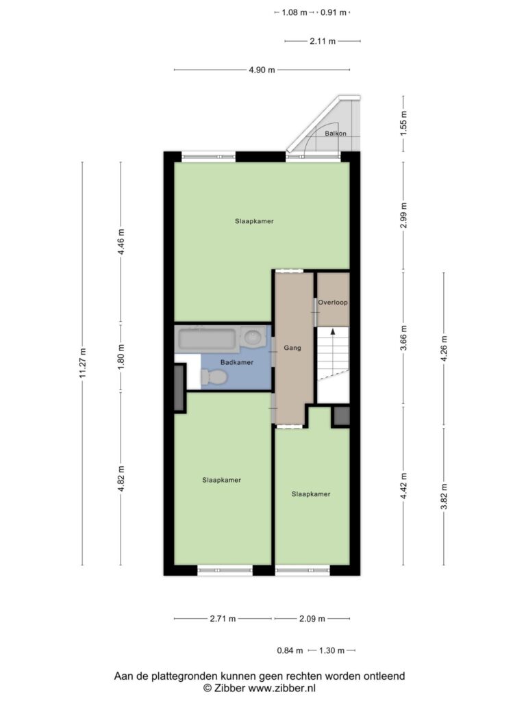 Derde verdieping: overloop, drietal slaapkamers, badkamer met ligbad en wastafel.