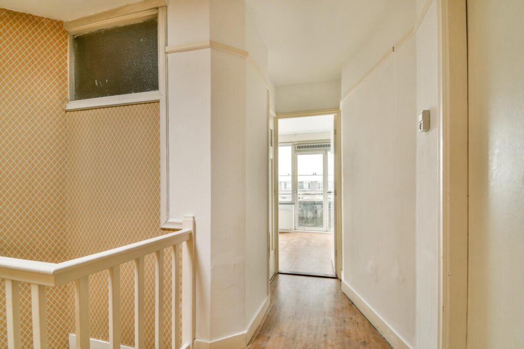 Entree, overloop, separaat toilet, slaapkamer I met toegang tot balkon I, woonkamer ensuite, balkon II, keuken en praktische trapkast.