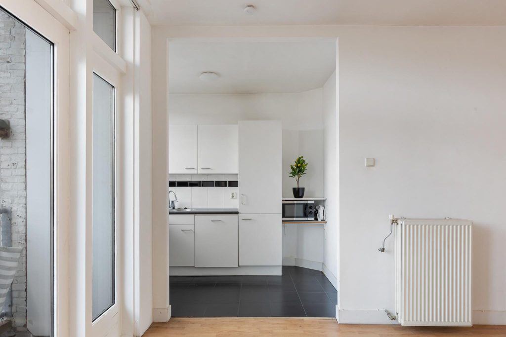 Entree/hal. Toilet met wandcloset en fonteintje. Badkamer is geheel betegeld en vv wastafel, mechanische afzuiging en douchecabine en deur naar klein balkon aan de voorzijde. Lichte en ruime woonkamer met openslaande deuren naar het balkon op het westen. Halfopen keuken met keuken in hoekopstelling en vv koel vries combinatie, vaatwasser, oven en 4 pits gaskookplaat.