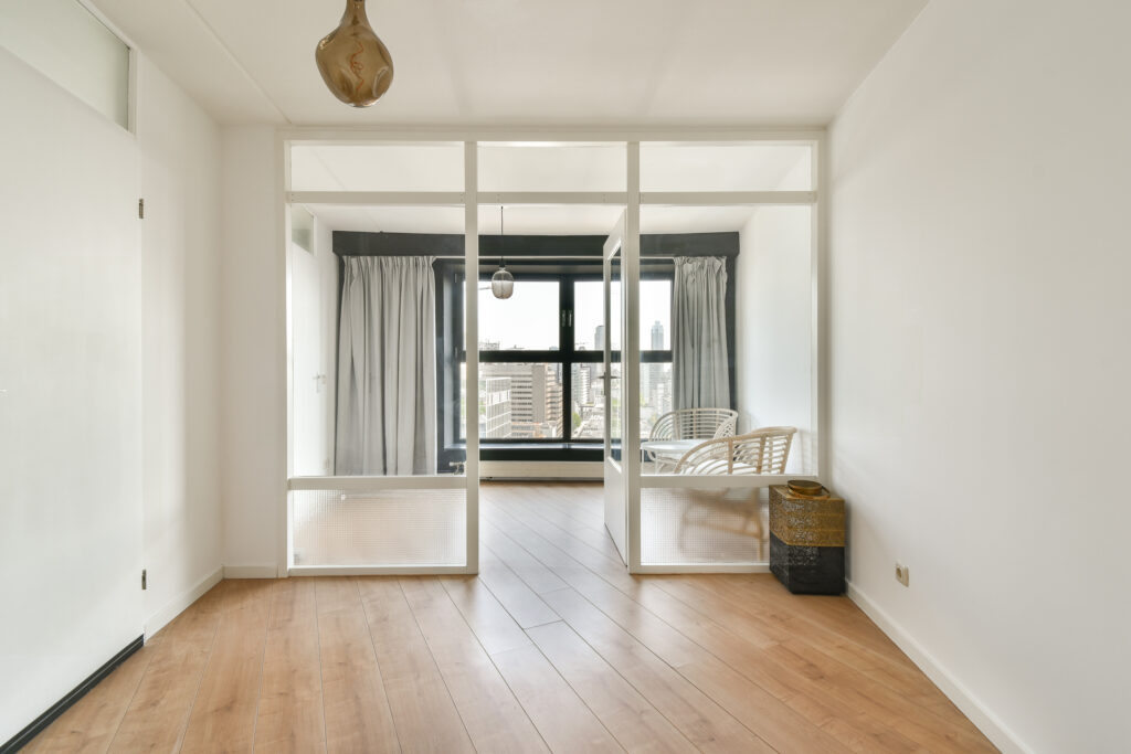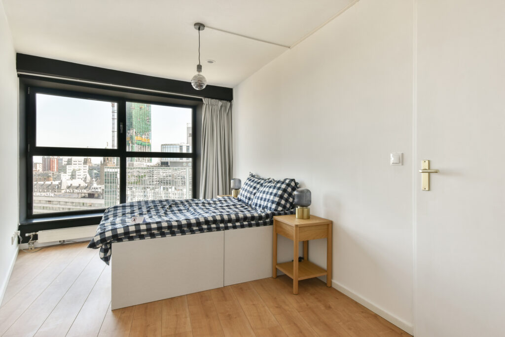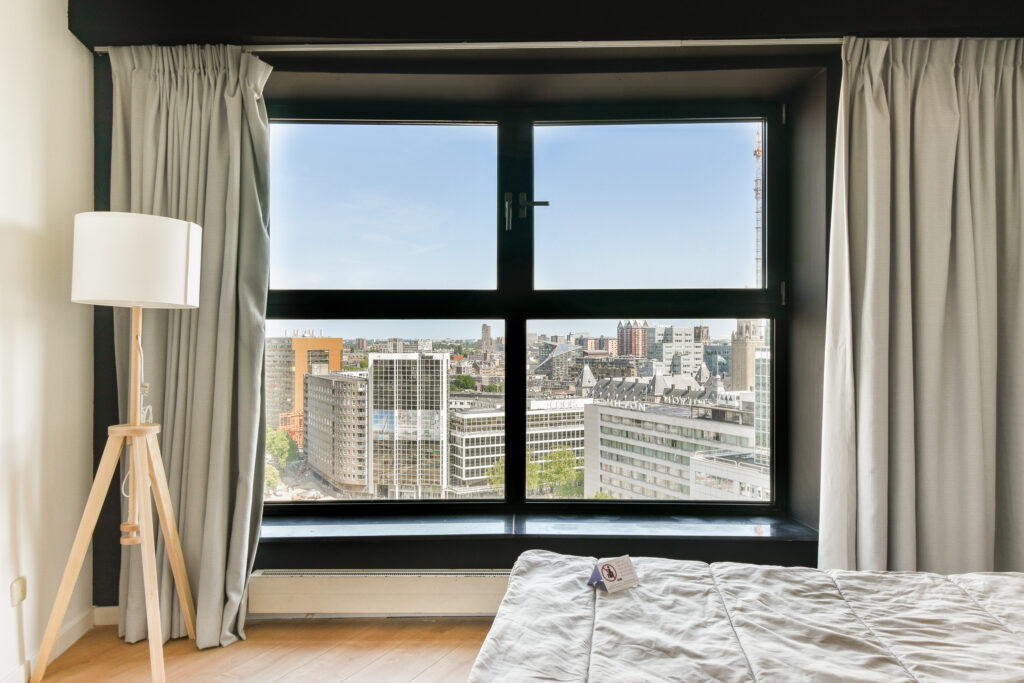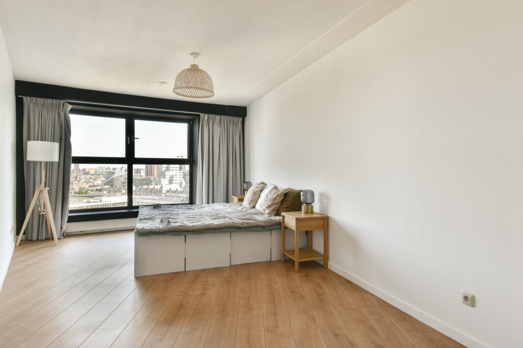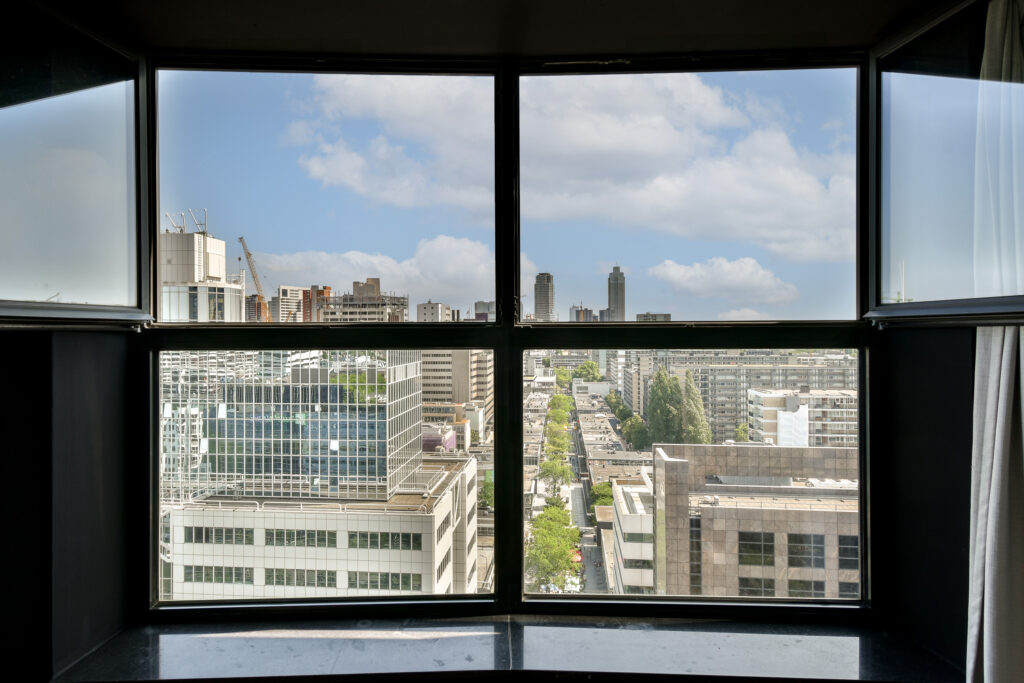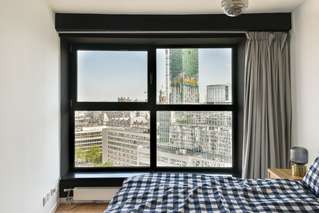 Het appartement beschikt over een royale en praktische indeling met maar liefst vijf kamers, waaronder een ruime living met grote raampartijen die het uitzicht volledig tot zijn recht laten komen. De hoogte zorgt voor een overvloed aan licht en een gevoel van vrijheid, terwijl je uitkijkt over het bruisende Rotterdamse stadsleven.